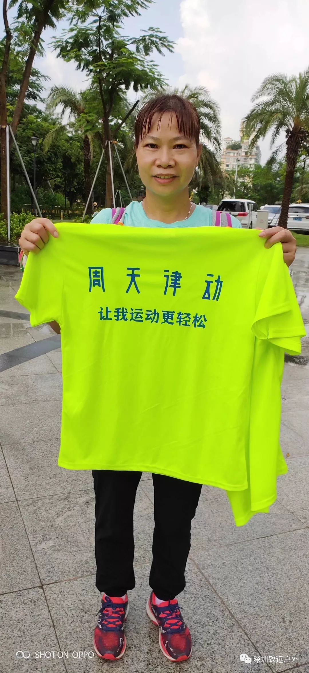 領(lǐng)取物資后小伙伴換上了靚麗的熒光綠文化衫
